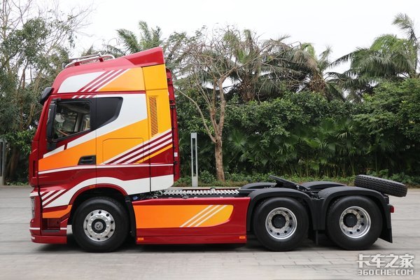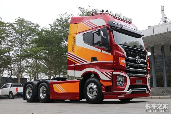 外观决定了第一印象,整车采用红、黄、白三种涂装,整体以红色为主,两侧的拉花以黄色为主,并且加上白色作为点缀。整体看上去非常亮眼,特别是前面罩两侧、大灯内侧还专门做了一些拉花来呼应,看上去很有欧洲卡车那种定制化涂装的味道。