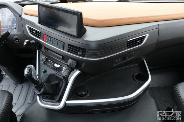 同时中控台上的按键和出风口、储物空间之类的也进行了优化,多媒体显示屏放在了中控台上面,在靠近副驾一侧还增加了一些储物空间,方便放置一些随车物品。仪表盘升级成了液晶屏加指针组合的方式,这也是目前国内重卡常见的配置,液晶屏可以显示的信息更加丰富,方便驾驶员了解车辆的状态。