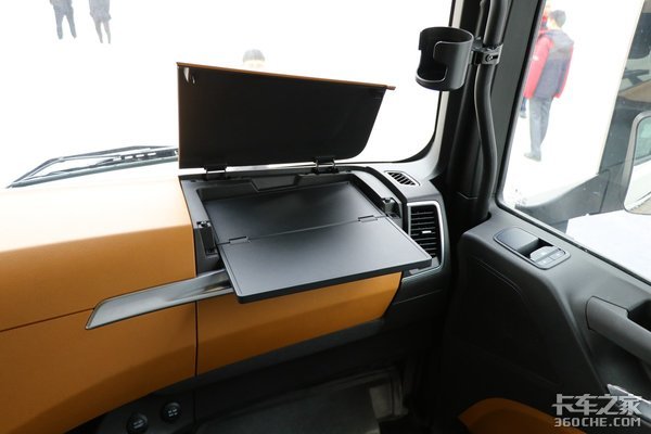 副驾驶有着一块承重3KG以内的工作台,卡友可以在上面使用笔记本电脑或者简单吃个饭,X6000还很贴心的在登车扶手位置加了一个杯架,方便副驾的使用。