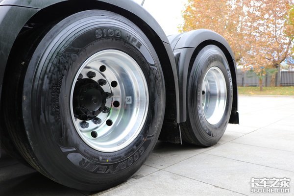 车轮前后均采用了铝合金材质,有效降低了整车重量,轮胎采用了固特异S100 HFE系列轮胎,尺寸为315/80R22.5,主打长途高速运输,特点为噪音低、耐用度高。车辆还采用了前后盘刹的设定,进一步提升制动耐久性和耐高温性。