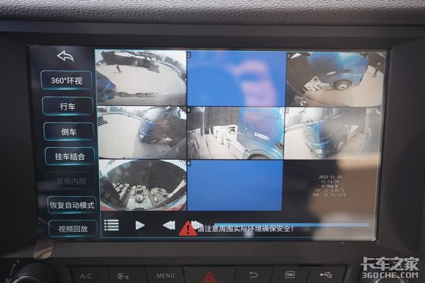 仪表盘采用了全液晶的显示,科技感十足,两侧为虚拟的转速和时速表,中间菜单集中了大量信息,整块仪表的显示很清晰,分辨率也很不错,运行速度和界面切换几乎可以达到乘用车的品质,似乎全液晶显示屏已经成为了当下牵引车的主流设计思路。