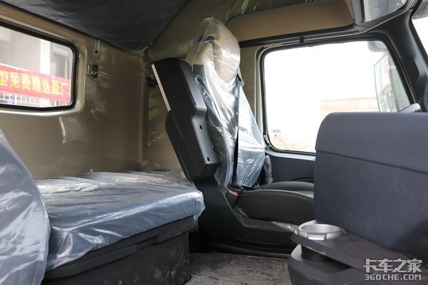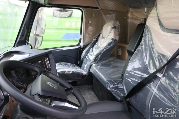 这款T7H采用高顶双卧驾驶室,整个驾驶室的空间还是非常宽敞的。内饰的配色采用深灰+浅卡其的配色,非常的上档次。这款车的主驾装配有支持多项调节的气囊座椅,副驾为一普通座椅,副驾的座椅是可以抬起的,方便从副驾位置传送一些日常用品(如被子、成箱的食品之类的)。