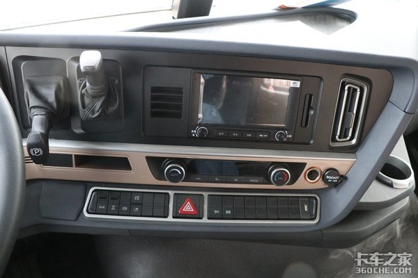 中控台部分采用了半包围驾驶员的设计,更方便驾驶员对其进行操控。中控台部分集成有驻车制动、挂车制动、多媒体大屏、空调调节旋钮、USB接口以及部分多功能按键。