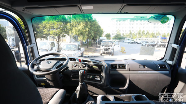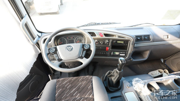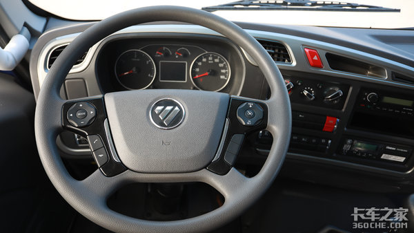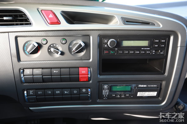 中控区域主要集成有手动空调、收音机和车载北斗系统终端等,布局简约大气,同时用户可根据自己的需要选装MP5多媒体系统和倒车影像,左下角的按键区域主要分布有驾驶室翻转、取力器、货厢升降等控制按键。
