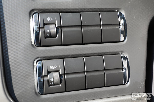 大灯高度调节和EBP节油开关集成在转向柱左侧按键区内,大灯共有三种调节角度供司机选择,EBP档位有E(经济)档、B(标准)档、P(动力)档三种档位,针对负载和道路情况,选择合适的智能省油开关档,可有效减低油耗。