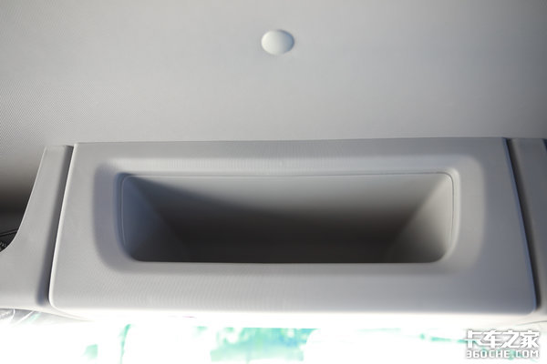 从工程自卸车使用场景考虑,司机对储物格空间的大小要求相对较低。这款车在驾驶室的车顶设计有3个开放式的储物格,副驾驶座前方也设计有一个封闭式的储物格,足以满足单人跑车时的日常储物需求。