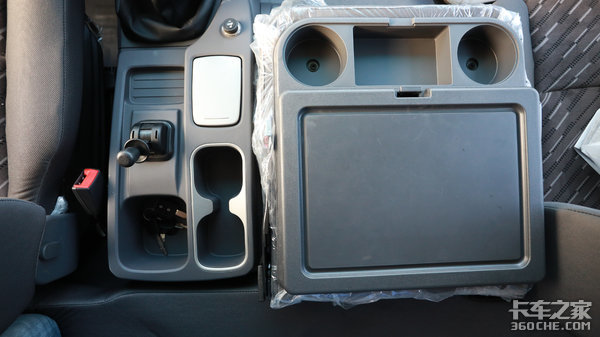档把区域设置了烟灰缸、点烟器、杯架和暖壶架,中间的座椅放倒后可充当小桌板,驾驶员在进行工作和吃饭时这个小桌板就能派上用场。桌板前部设计有两个杯架,掀开小桌板,下面是一个储物格,增加了车辆的储物空间。