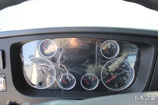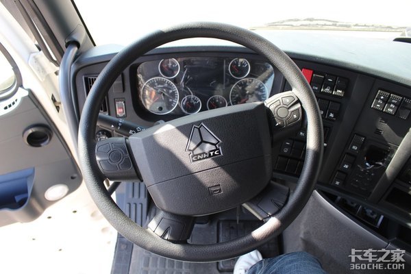 我们再看看这款豪沃T7H的内饰,采用高顶双卧排半驾驶室,整个驾驶室的空间还是比较宽敞的。除了驾驶室配置有四点气囊悬置,主驾座椅还配置了支持一键充放气及支持多项调节的气囊座椅,可以说把该车的舒适性直接拉满。