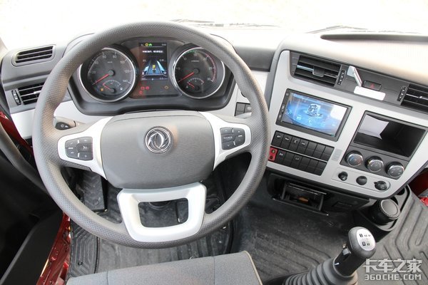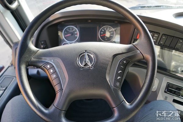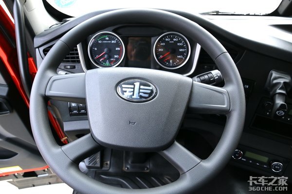 进入到驾驶室内,可以看到方向盘已经是解放目前比较新款的四辐方向盘,虽然没有集成多功能按键,但造型与J7一致值得称赞,同时也易于打理。