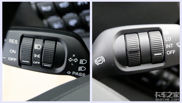 位于方向盘后方的控制手柄也是解放的新款,灯光控制、定速巡航等集成在左侧,右侧控制杆则是发动机制动开关和雨刷控制器,手感和样式都很不错。