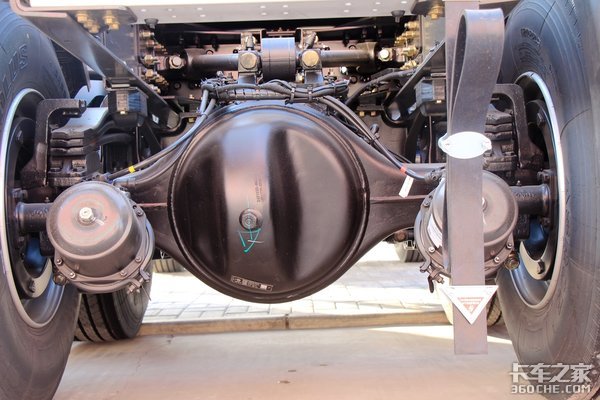后桥部分,这辆J6P价值版采用解放435冲焊桥,后桥速比3.7,整车总速比2.866,完全满足砂石运输的工况需求。与此同时,还能看到该车采用楔式制动器,刹车效能更高,行车更加安全,同时重量也更轻巧。