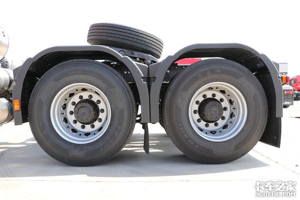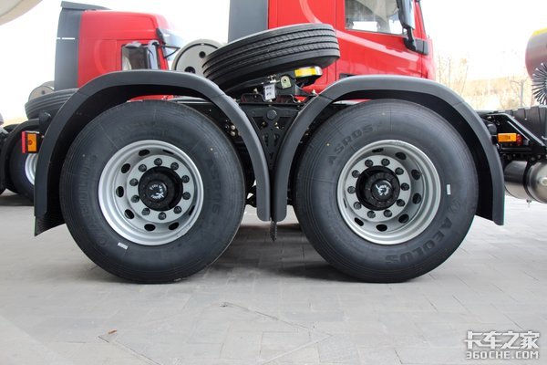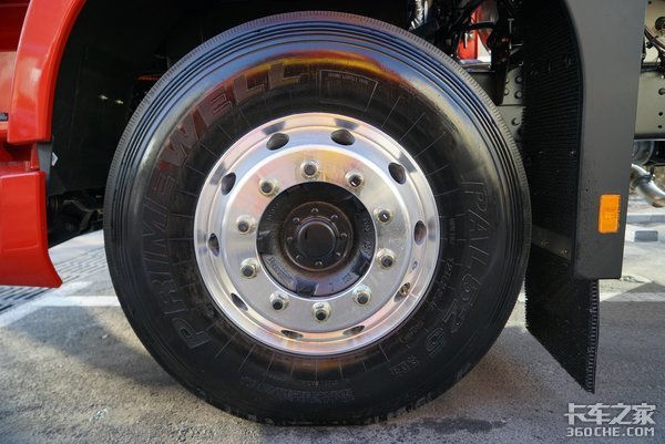 轮胎采用型号为12R22.5的轮胎,轮圈全部采用铝合金轮圈,相比普通钢圈,单个减重超过了120kg。