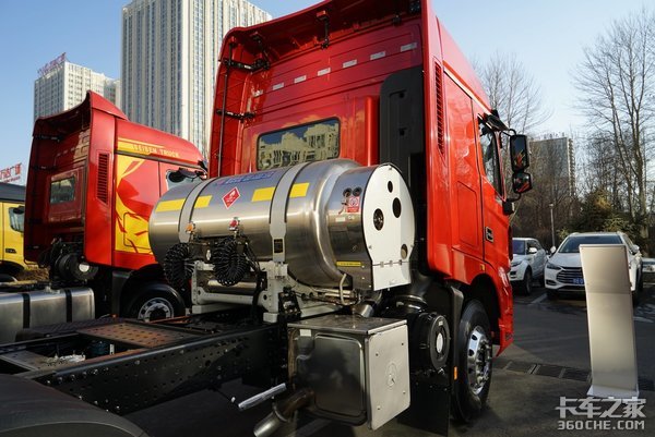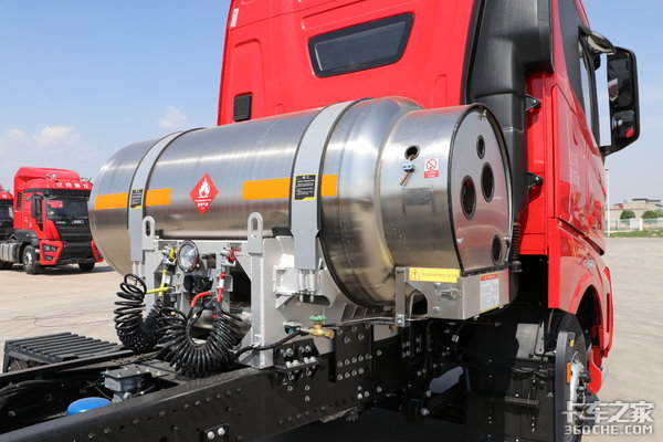 LNG气罐位于驾驶室的正后方,1000L的LNG气罐大约可以储存330kg气体,按照百公里36kg气耗计算,每次加满气罐后的续航里程约为920km。