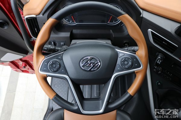 方向盘采用了三幅式多功能设计,黑、黄撞色拼接呼应了整体的内饰风格;握把处进行了皮质包裹,更具乘用车设计理念。多功能按键区域集成定速巡航、多媒体控制、蓝牙电话接听及挂断等功能,还带有语音输入模式,便利性十足。