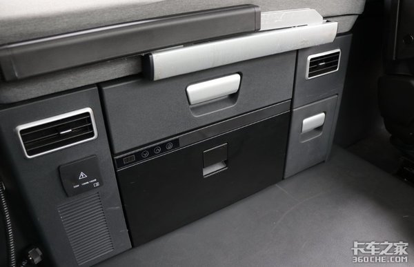在卧铺下方杰狮H6还配备了车载冰箱、暖风出风口、储物抽屉等等。另外该车在用电设备的配置也是十分大方,杰狮H6配备了1500W的大功率逆变器,可外接更多用电设备,满足卡友在日常行车上对于电子设备和电器的使用需求。