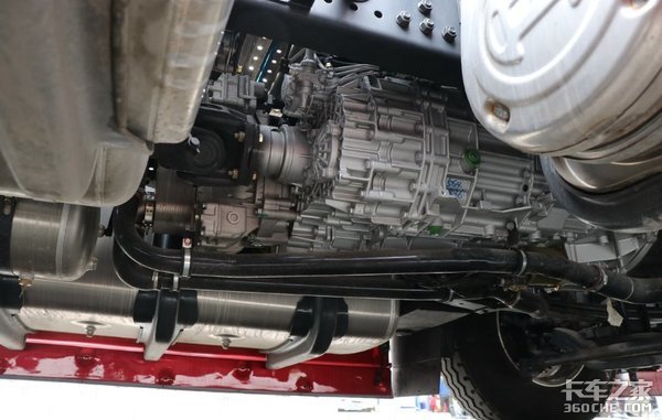 实拍车型变速箱匹配的是来自法士特最新技术的C12JSDQXL260T 12挡手动变速箱,该变速箱为直接挡设计,头挡速比14.09,最高挡速比为1。采用了双中间轴和斜齿的结构,外壳为铝合金材质,轻量化效果突出。同时也配备了来自法士特的FHB400型并联式液力缓速器。