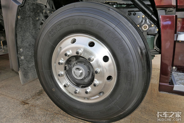 此外车辆全车配备双钱的12R22.5型号低滚阻公路真空胎和康迈50万公里免维护轮端,并且导向轮还使用了铝合金轮圈。