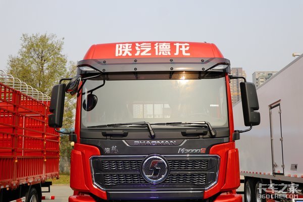 中网部分更偏向于陕汽X5000,鱼鳞状的设计看上去别具一格,而且周围增加了镀铬两条来进行装饰,整体前脸呈黑红搭配设计,这也是陕汽车上的经典配色。两侧的导流槽可以在行驶过程中保持车门两侧的清洁。