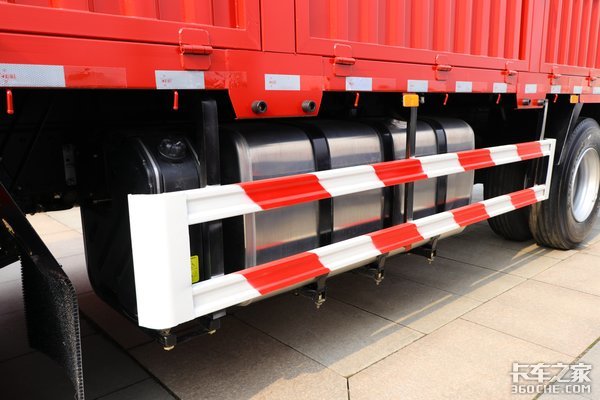 实拍的这款车采用的是栏板上装,上装尺寸为9500x2450x600mm,货厢前方带有龙门架,而且龙门架两侧设计有示廓灯,底盘三侧设计有防护栏,四周均匀分布了捆绳钩和缓冲垫,原厂货厢细节设计方面很到位。