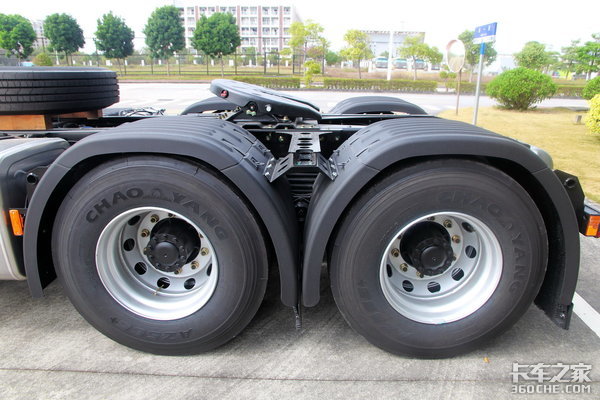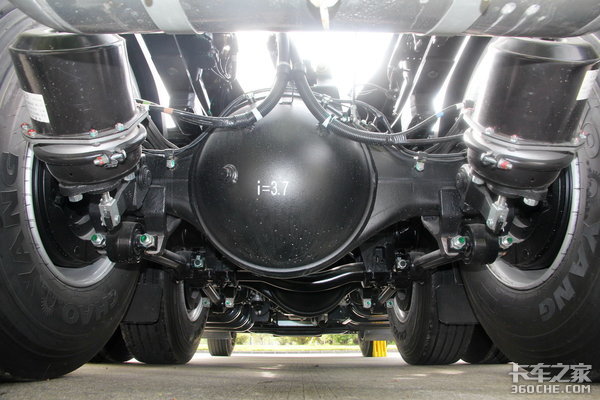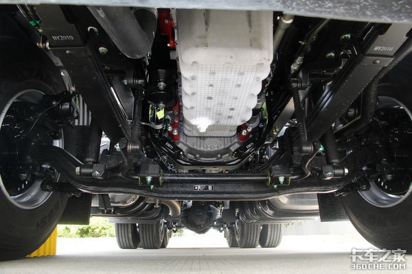 与这款发动机匹配的变速箱可选法士特和采埃孚两款,实拍车型与之匹配的是一台型号为12JSD200TA-B的法士特12挡手动变速箱,注油量16L,头挡速比12.1,最高挡为超速档,速比为0.78。实车搭载速比为3.7的双后桥,最高允许载荷达18000kg。
