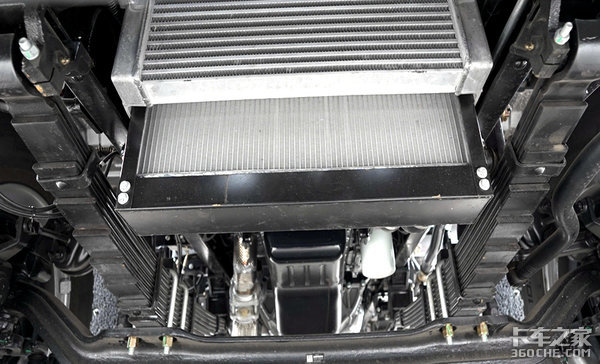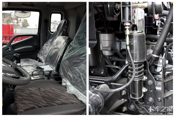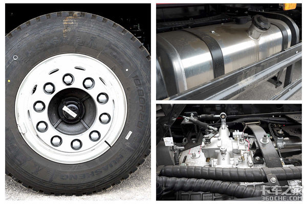 实拍车采用的是来自品牌华盛的规格为10R20的轮胎,油箱装配的是一个容积为300L的铝合金油箱。这款车不光油箱采用的是铝合金壳体,发动机外壳、变速箱外壳以及储气筒均采用的是铝合金材质,车身的总重控制在了10T,也就是说这款车可装卸的货物重量在20T左右。