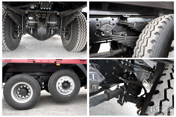 底盘方面,这款福田瑞沃大金刚ES7的后桥采用的是457后桥,后桥速比5.286。采用双层车架+多片簧的设计,承载能力毋庸置疑,并且装配有支持后提升的车桥,在空载时就可将车桥进行提升,不仅可以减少轮胎的磨损,还能帮助车主省油,非常给力,支持后提升的这根车桥采用的是钢板弹簧搭配气囊悬挂,保证承载能力的同时还帮助整车实现了降重。