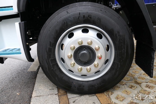 实拍车配备的是275/80R22.5型号轮胎,这条轮胎采用了四条直线型花纹沟设计,使得它的直线行驶性能和防湿滑性能非常优异,很适合在铺装路面行驶。