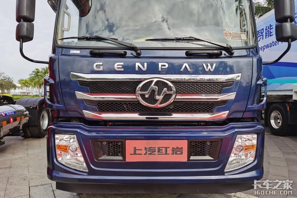 车辆外观采用了传统的家族化设计,大尺寸的遮阳罩,既有质感还能起到很好的遮阳效果,中间“上汽红岩”四个大字表明其身份;小倾角的前挡风玻璃能够带来更好的视野,减少盲区;挡风玻璃下的两个拉手可以增加司机清洁前档工作时的便利性,小细节值得称赞。
