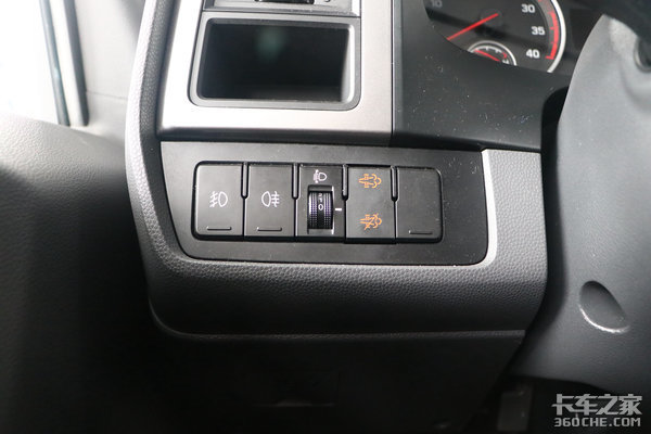 方向盘左侧布置有功能按键,集成前后雾灯、大灯高度调节以及DPF再生开关、禁止开关。这里提醒一下各位卡友,当DPF再生警示灯亮起时,我们需停车进行人工干预,将车停至远离加油站、火源等易燃易爆的地方,再打开DPF再生开关即可。如因特殊情况需驶离该位置,则可以按下旁边的禁止再生开关。