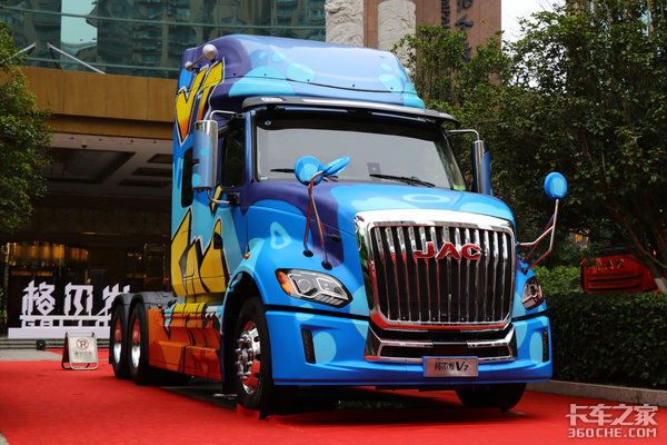 实拍的这款江淮格尔发在外观涂装上采用定制化的彩绘,长车头的造型与超炫丽的涂装相搭配,给人一种独特的美观,让人过目不忘。与平头车不同,该车在后视镜的照地镜设计上,是布置在车灯处的,这样对周围状况的观察更方便。