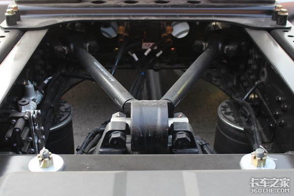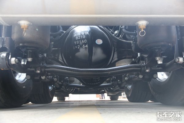 底盘方面,该车采用13T单级减速后桥,速比为2.64(可选2.85)。在悬挂形式上,采用2/4前钢板后气囊的悬挂形式,后悬架采用8气囊设计。搭载铝合金双油箱设计,总容积为1220L.同时还带燃油切换阀、燃油水加热等功能。