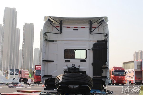 在驾驶室的后方,这款J7装配有原厂导流罩和后围扰流板。导流罩高度可以根据挂车高度的不同来调节,使其与后方货箱相匹配,达到行车过程中降低风阻的作用。