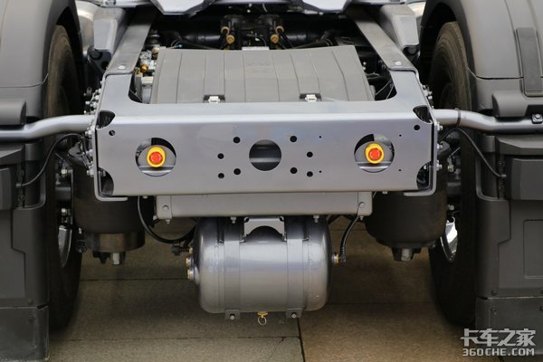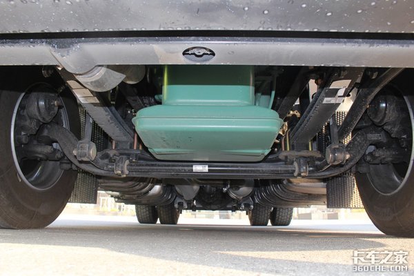 底盘方面,该车采用13T后桥,配置有气囊悬架。油箱为双油箱的设计,容积为880L+300L。轮胎是采用的固特异轮胎,规格为315/70R22.5,而且为了降低车辆的自重,全车轮圈采用铝合金材质。