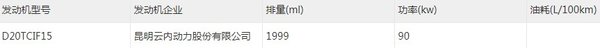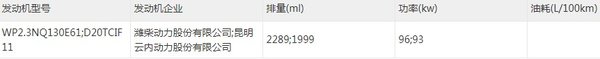 申报的底盘车在动力上将搭载三款发动机,分别有云内动力D20TCIF15发动机(国六),排量1.999L,最大功率90千瓦;云内动力D20TCIF11发动机(国六),排量1.999L,最大功率93千瓦,;潍柴WP2.3NQ130E61发动机(国六),排量2.289L,最大功率96千瓦。