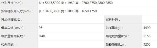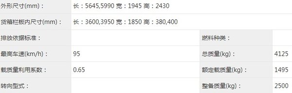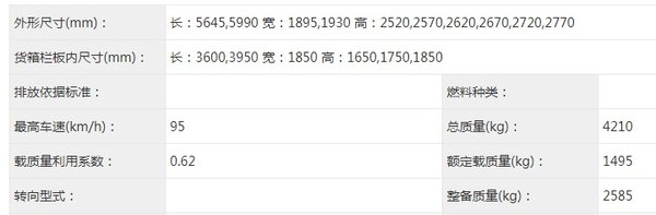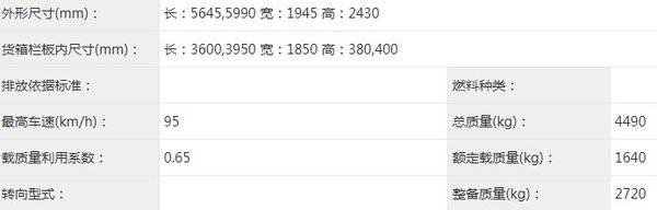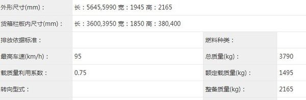 栏板货厢内尺寸为3600/3950x1850x380/400mm,车辆总质量3790kg,整备质量为2165kg,额定载质量1495kg。从车辆数据上来看,这款车已经能够很好满足大部分卡友对小卡车型的使用需求。