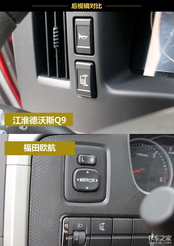 两款车都带有电加热的功能,在雨雾天气下可以帮助后视镜快速除水除雾,保证驾驶员的视野清晰,按键均设计在仪表盘的左下方。欧航的加分项在于除了电加热功能以外,还配有电动调节的功能,方便驾驶员随时操作。