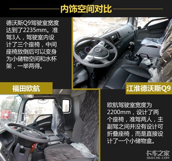 驾驶室的配置也是卡友们在选车时的决定因素之一,德沃斯Q9和欧航都采用的是排半驾驶室,不同之处在于德沃斯Q9驾驶室宽度达到了2350mm,准驾3人,驾驶室内设计了三个座椅,中间座椅放倒后可以变身为小储物空间和水杯架。