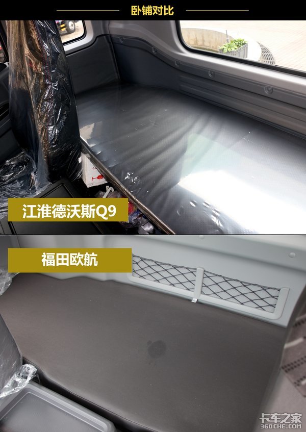 4x2大单桥9米8车型主要应对的是中短途城际运输,基本上是单人单车,在等待装卸货的时候可能在车上休息,因此这两款车都采用了单卧铺设计,都采用驾驶室后延式设计,宽度表现相当,其中德沃斯Q9的卧铺宽度为600mm,亮点在于欧航的卧铺旁带有小网兜,可以放置一下随身物品。