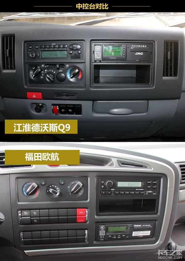 中控台部分的功能设计,两款车大同小异,都包括了空调、收音机、行车记录仪等,打成平手,相比之下欧航的设计看上去更时尚一些。