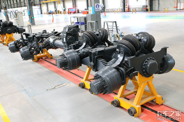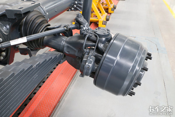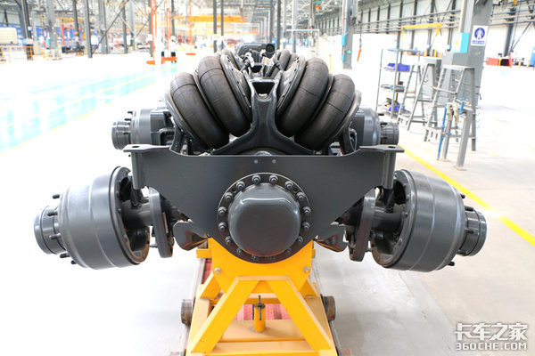 中央脊骨梁将传动轴、电子元件以及部分管线包裹在里面,相当于给这些部件穿上了一层强大的铠甲。同时长征太脱拉在后桥的摆动半桥处使用了气囊式的减震结构,配上独立悬挂让每组轮胎各自为营,重载时能提供更好的潜力。