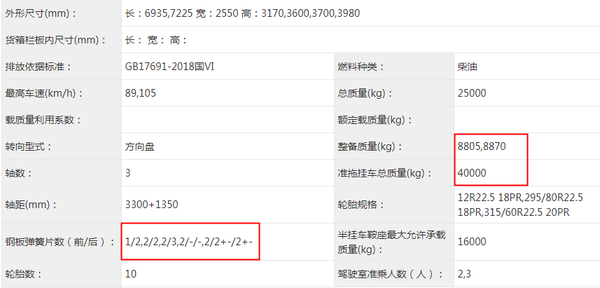 此外车辆基础尺寸数据方面也是我们常见的数据参数,此处值得关注的有两个地方,其一是车辆自重最低可达8.8吨,其二是除采用少片簧轻量化悬架之外,公示车型提供后桥气囊悬架。