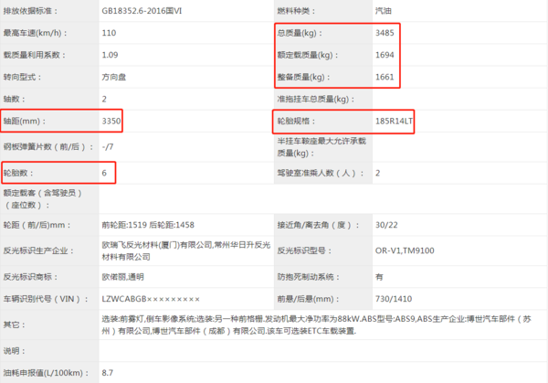 另外该车公告总质量为3485kg,底盘整备质量为1661kg,也就是说该车拥有1694kg的合规装载质量,相较于一些轻卡车型来说,这样的合规装载质量也毫不逊色。