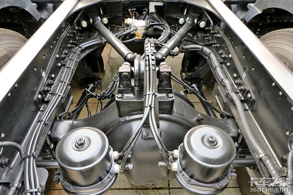 车辆前桥、后桥全部匹配的是汉德桥,型号分别为7.3吨级和13吨级单级减速桥,后桥速比为3.7。后桥位置采用断开式平衡轴,并且整车采用鼓式制动器、前后少片簧轻量化悬架。