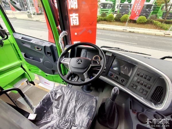 驾驶室采用了半环岛式驾驶台设计,并用了一圈大号的银色饰板包围,驾驶员操作各功能按键比较便捷。而中间镶嵌的这块液晶显示屏,该尺寸在行业里也算得上是豪气。另外,支持选装360°环视,6路摄像头全方位保障行车、倒车安全。