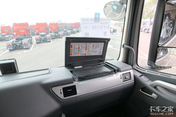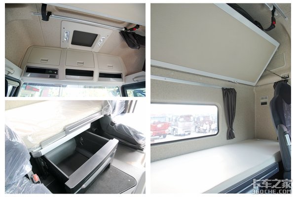 这款J7采用高顶双卧平地板驾驶室,而半环绕式的操作台也不会太占用驾驶室的空间。所以整个的空间还是很大的,不管是主副驾之间换乘,还是去卧铺区域休息,都十分的方便。