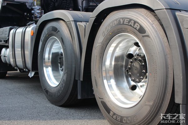 在轮胎选择上,这辆J7的轮胎规格为12R22.5,为固特异品牌轮胎,而且全车的轮圈都是采用铝合金材质,大大减轻了车辆自重。