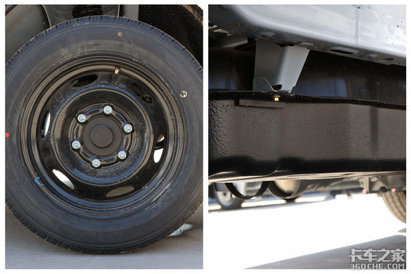 实拍车装配的轮胎是来自百威品牌的规格为185/65 R15LT的轮胎,15寸轮胎可以提高车辆在行驶和制动时的稳定性。车辆的侧面还装配有一个容积为45L的铁质油箱。飞碟Q3的车身是钢结构,车身骨架60%以上使用高强度钢,同时采用铝质副车架和控制臂,相比铁件减重30%;轻量化的同时,拥有更高的安全强度。