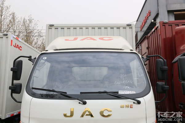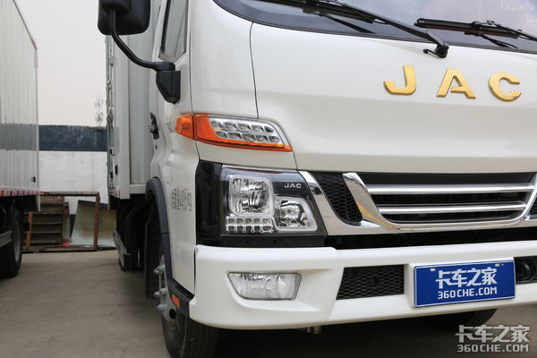为了降低车辆在行进过程中的风阻系数,提高燃油经济性,驾驶室上方安装有原装的导流罩。导流罩上喷涂有大写的“JAC”车标,品牌形象得到进一步强化。