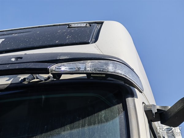 车顶的扰流板集成2个LED示廓灯,在通过一些城区低矮桥洞时,可以帮助司机观察方便通过。同时下方的遮阳罩上也还有2个示廓灯。
