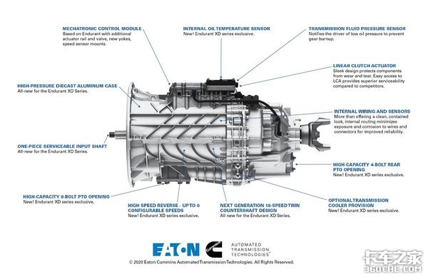 【卡车之家 原创】近日,康明斯伊顿在其官网上发布了最新的Endurant XD变速箱,根据公开资料显示,该款变速箱采用Endurant HD(国内名字叫赢动)类似的控制模块设计。Endurant XD一共有18个前进挡和6个倒挡,主要是为了相对重载和路况相对复杂的工况而设计。